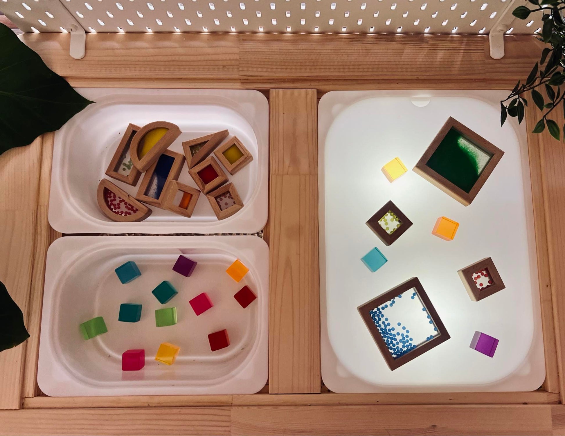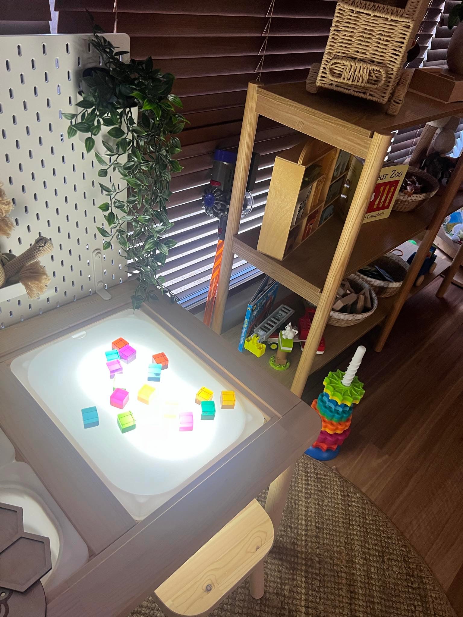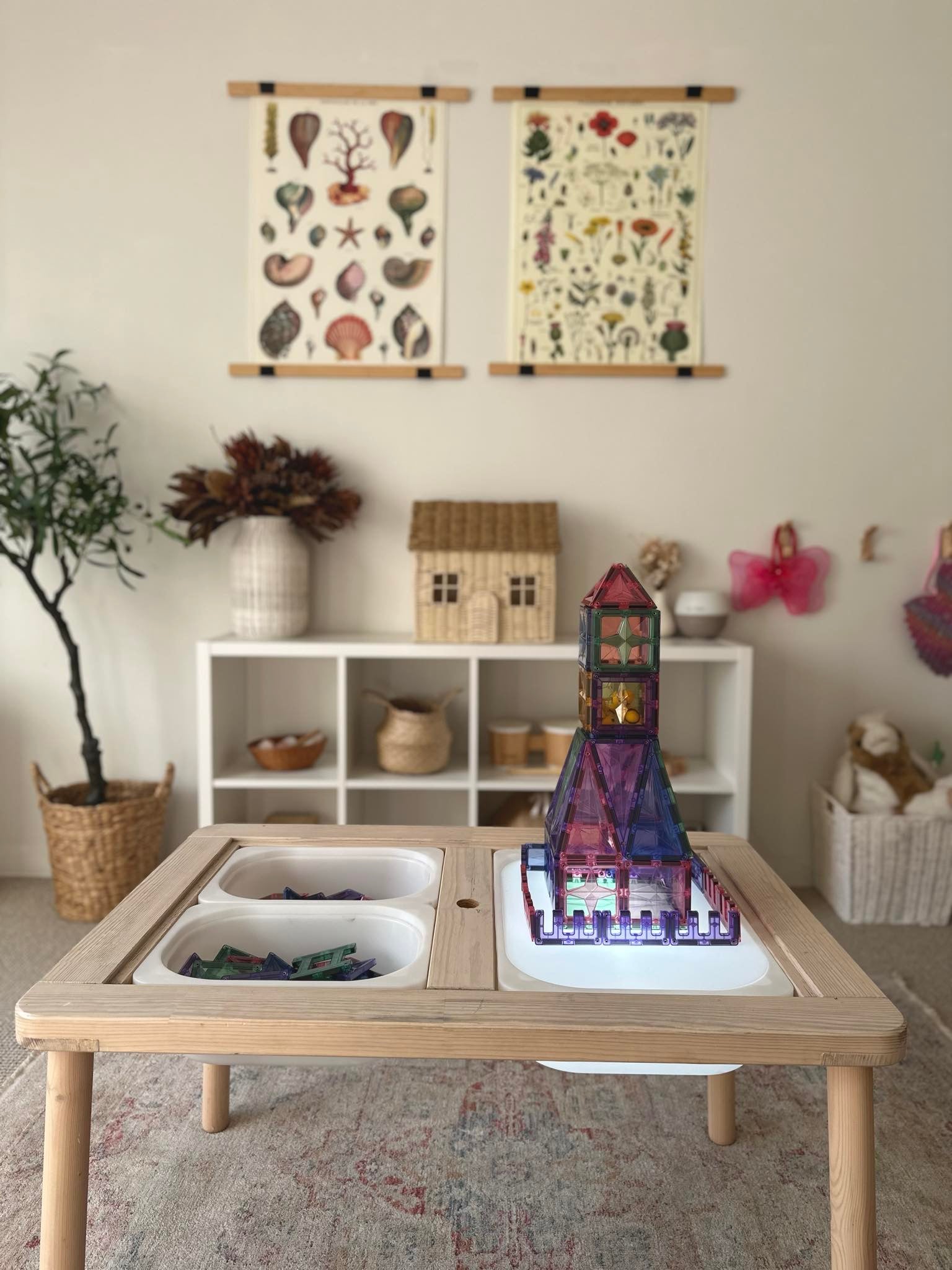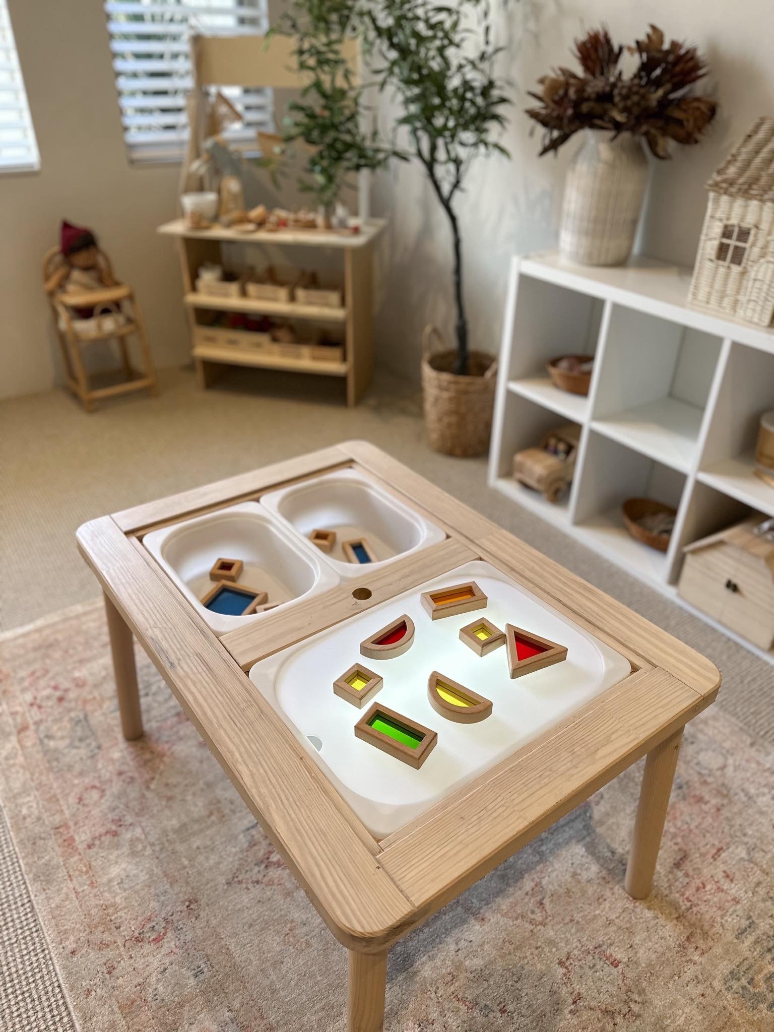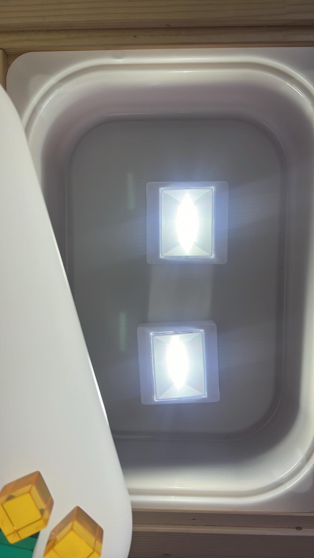 Flisat Insert. Made from 3mm Premium Acrylic, these inserts can be used as a light table (2 lights included) or as a writing board (with whiteboard markers), suitable for the IKEA Flisat Activity table. Fits the Trofast Large Bins