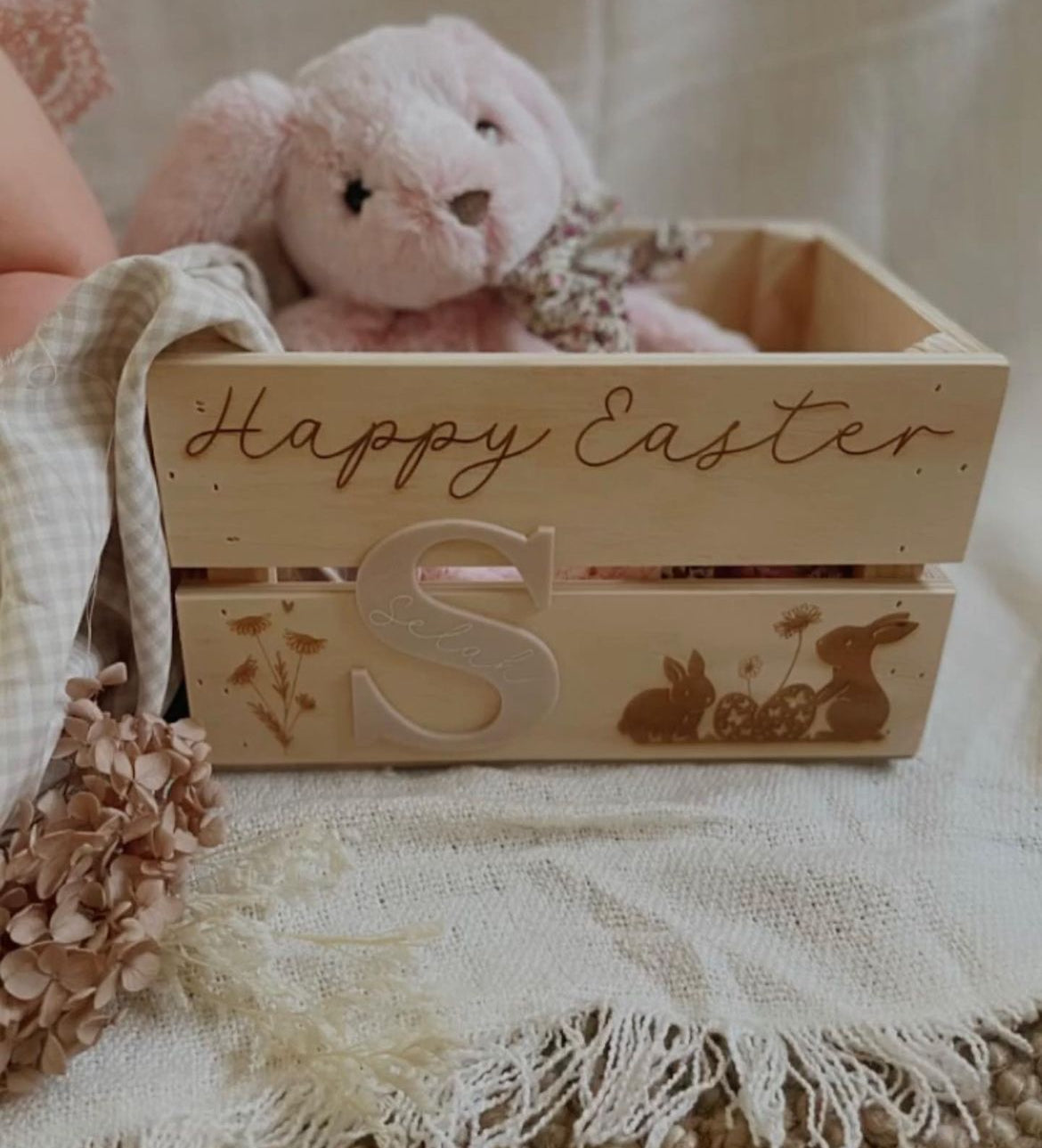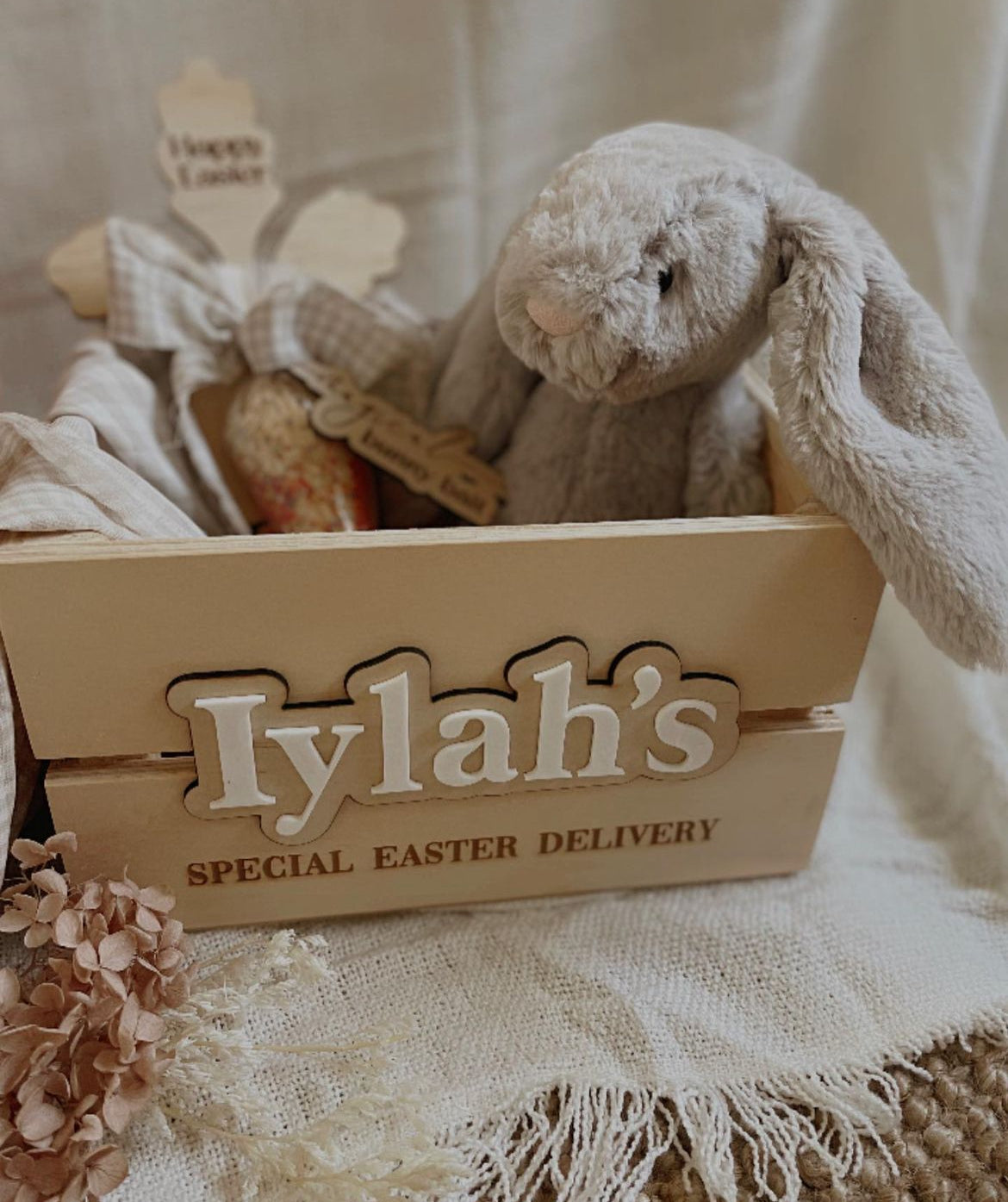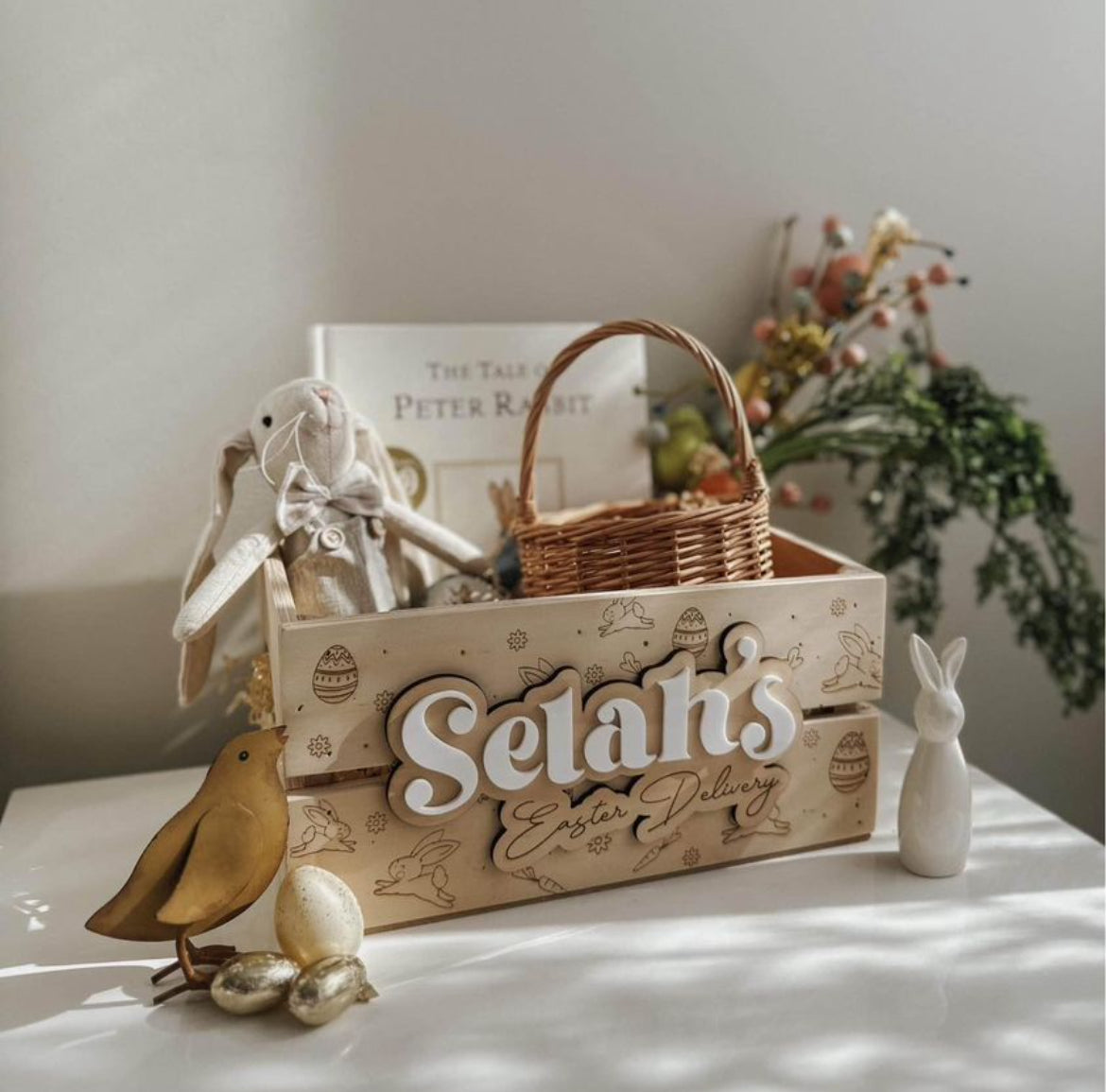 Handmade right here in WA!! Personalised wooden easter crate that can be used as a hunting basket, delivery box from the bunny by filling with special pjs, plush toy & easter eggs, and also a keepsake box!