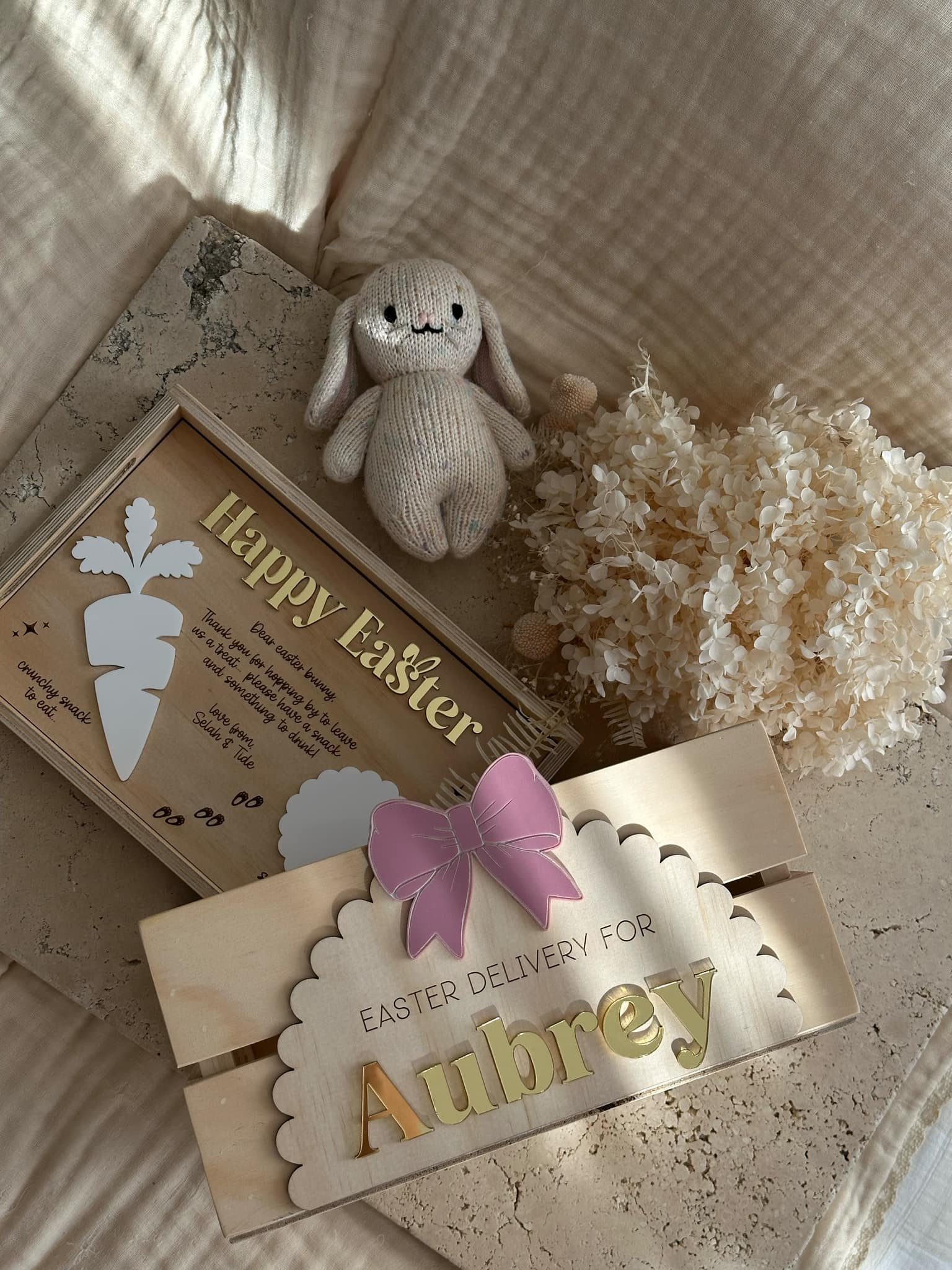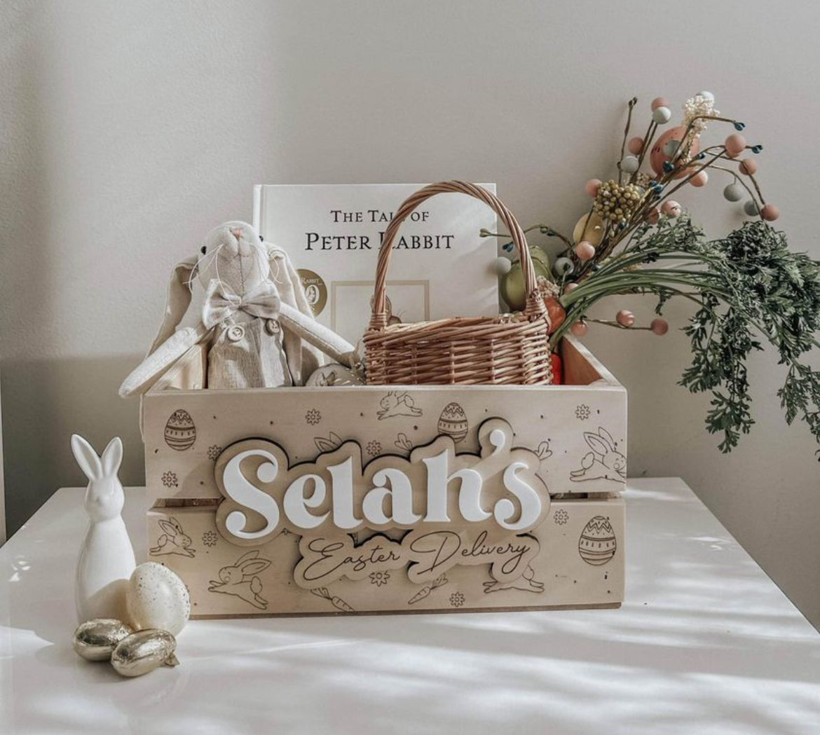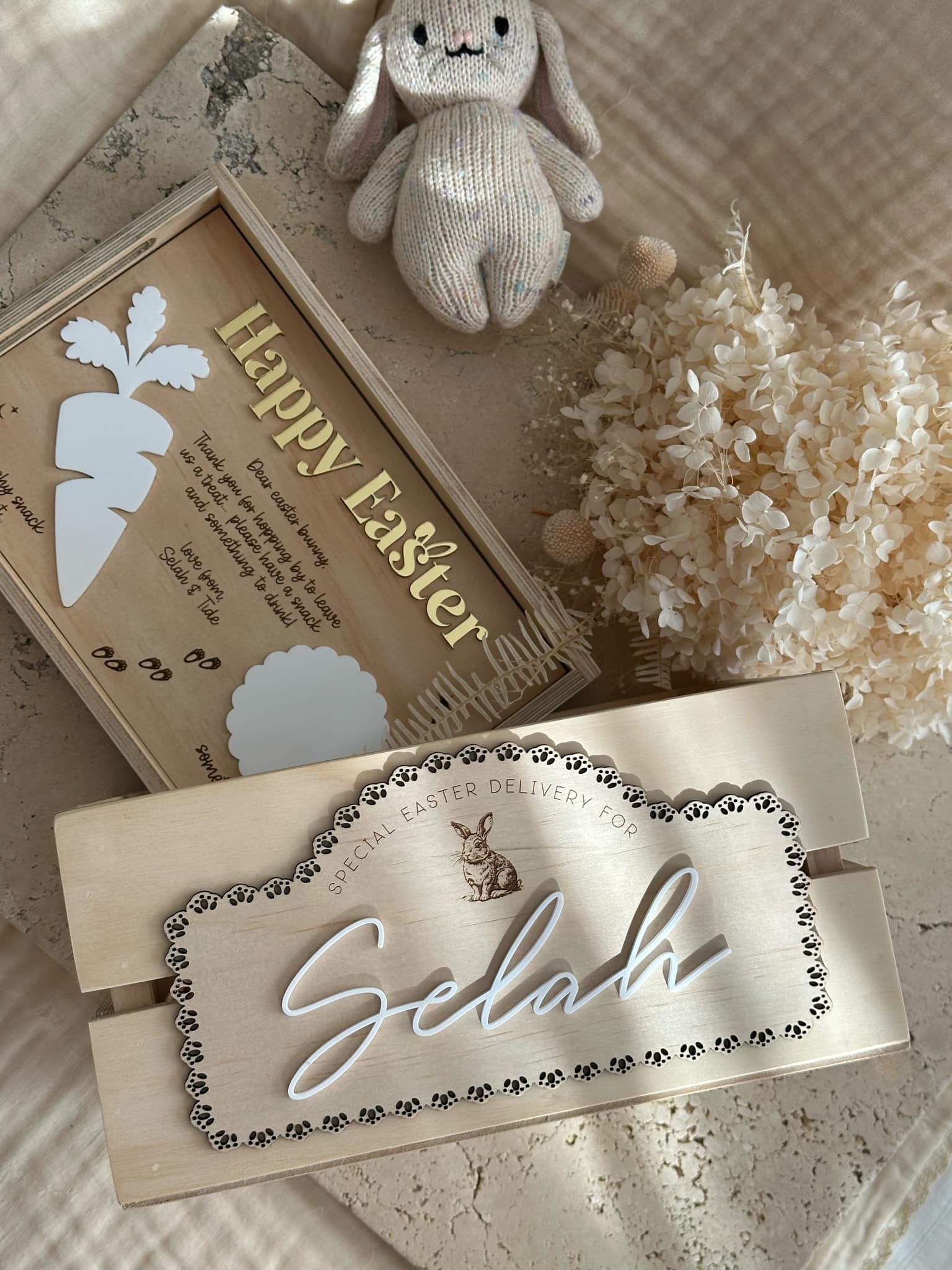 Handmade right here in WA!! Personalised wooden easter crate that can be used as a hunting basket, delivery box from the bunny by filling with special pjs, plush toy & easter eggs, and also a keepsake box!
