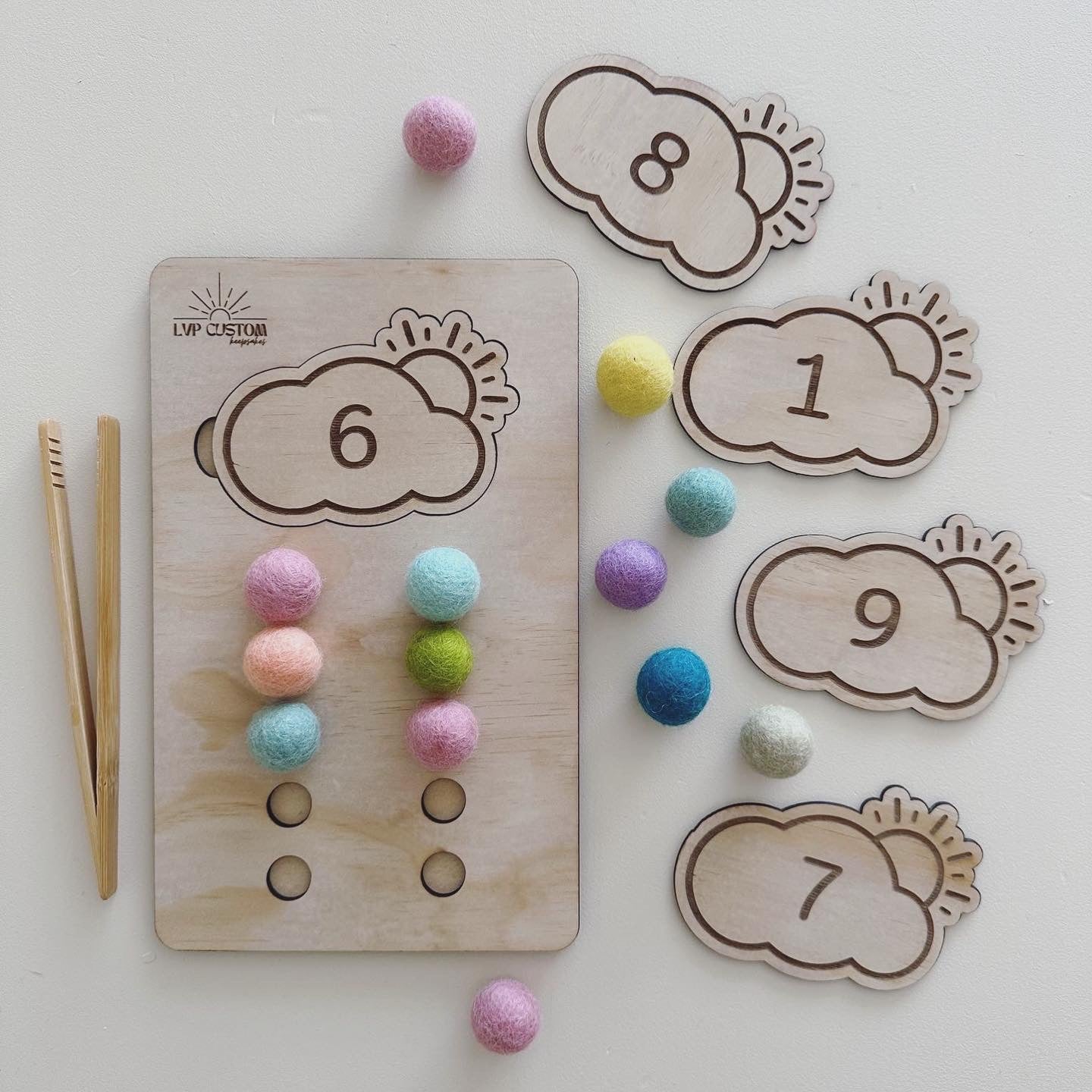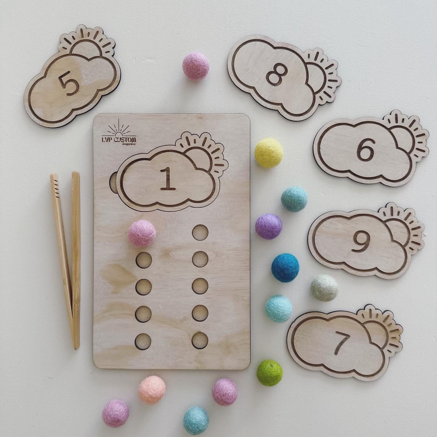 Includes: 1 Wooden Counting Board, 10 Numbered Clouds, 10 Felt Balls & 1 Bamboo Grabber
