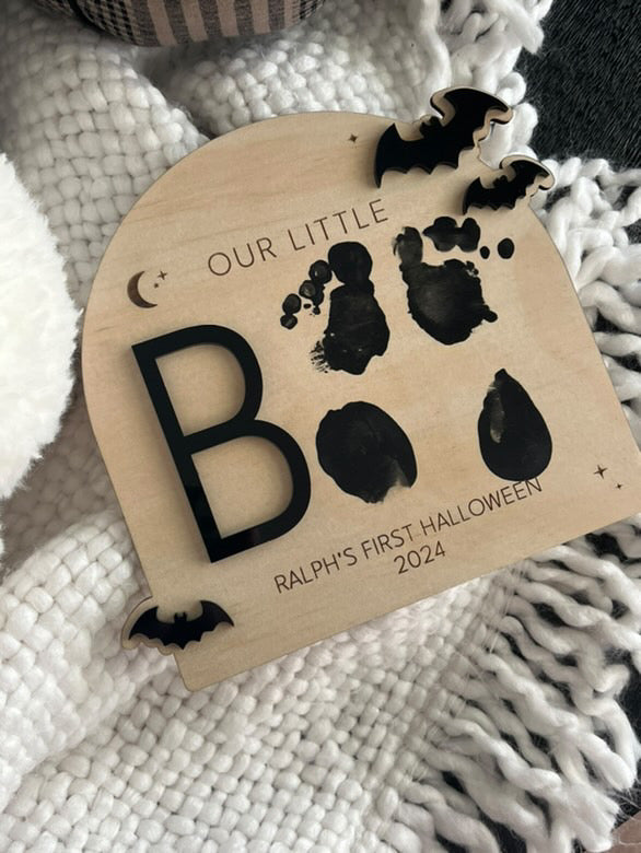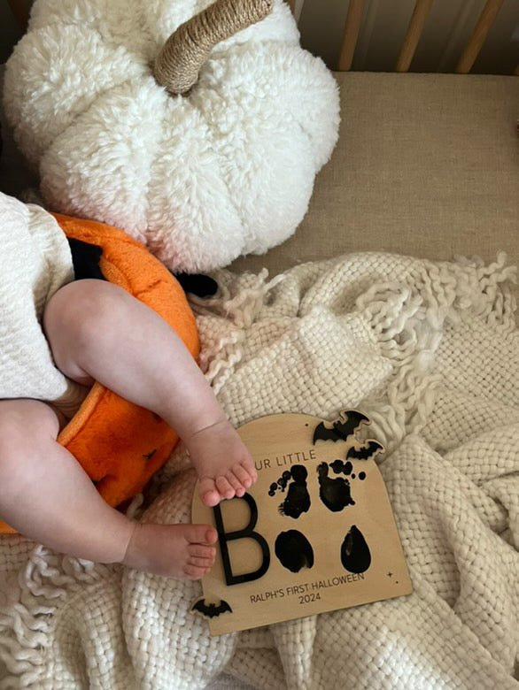 Perfect for Halloween, this adorable sign allows you to add your little one's footprints, turning them into a cherished memory for years to come. Whether you're making it as a festive decoration or a heartfelt gift, this easy-to-customize sign is the perfect way to celebrate the season with a personal touch. Capture the magic of Halloween with a unique keepsake that will make you smile every time you see it!