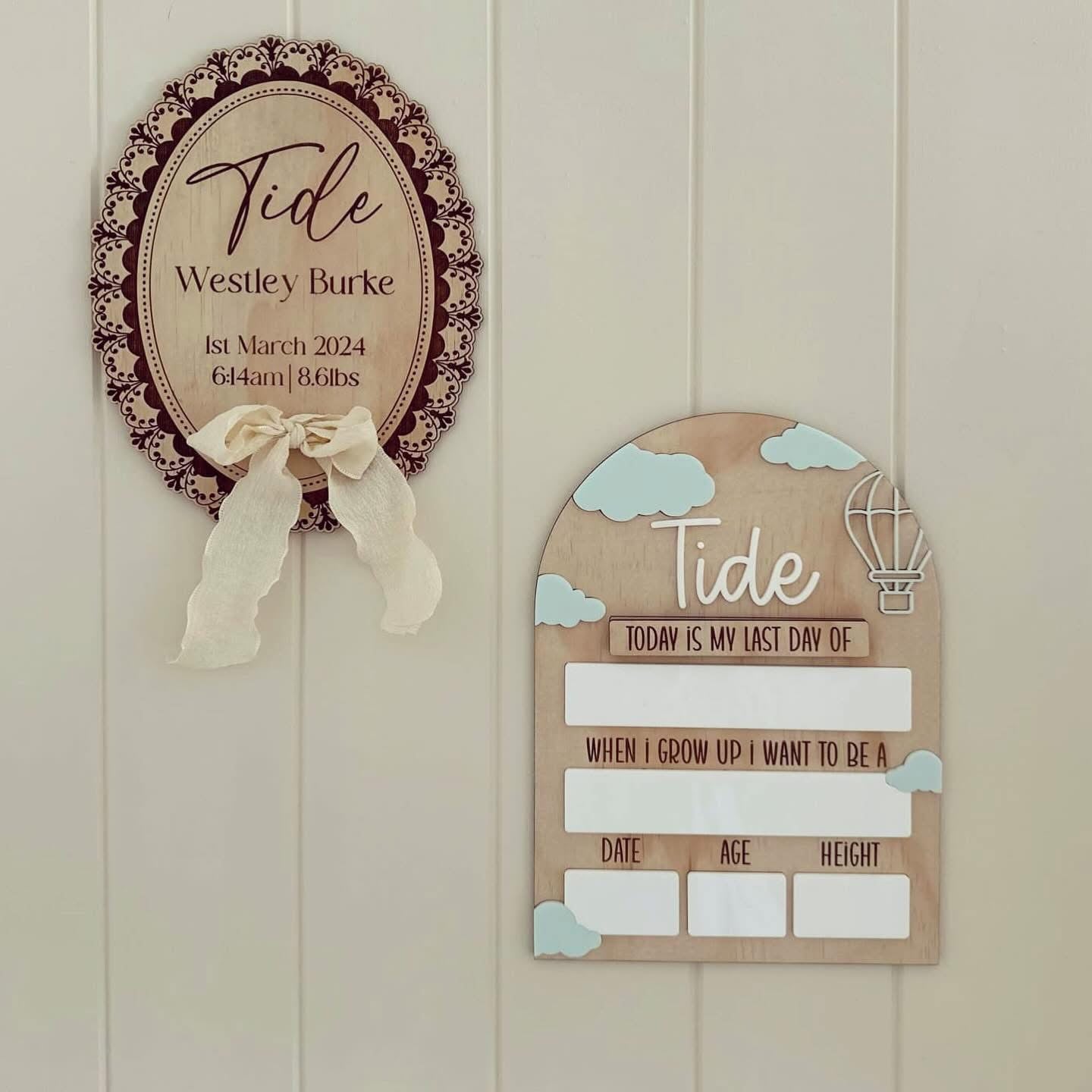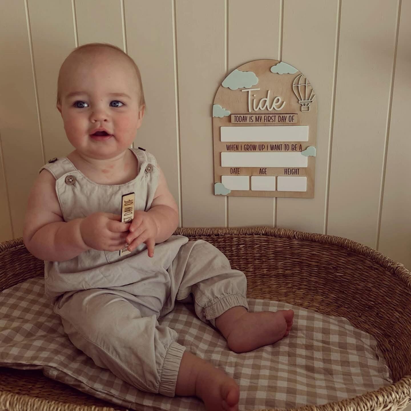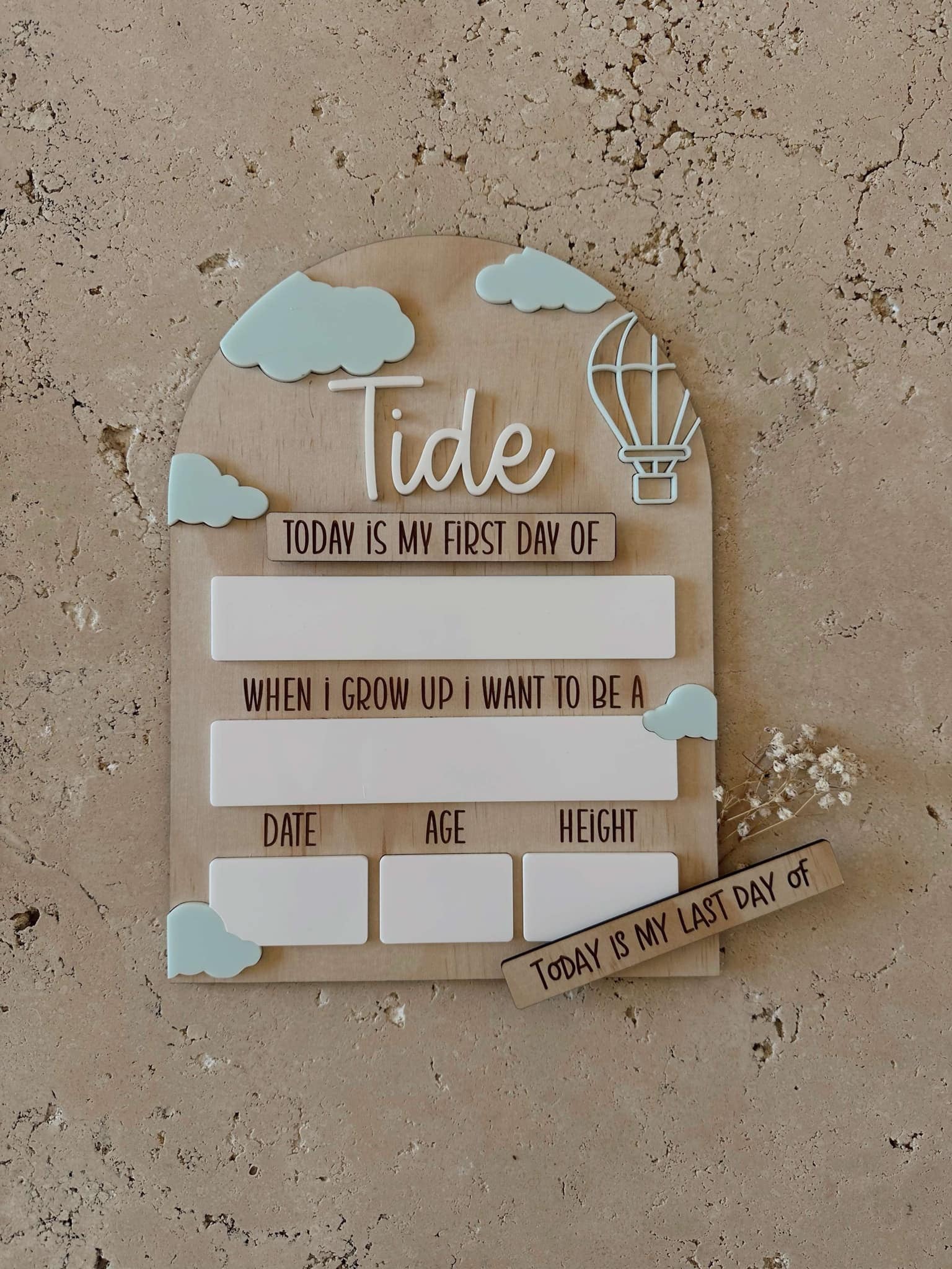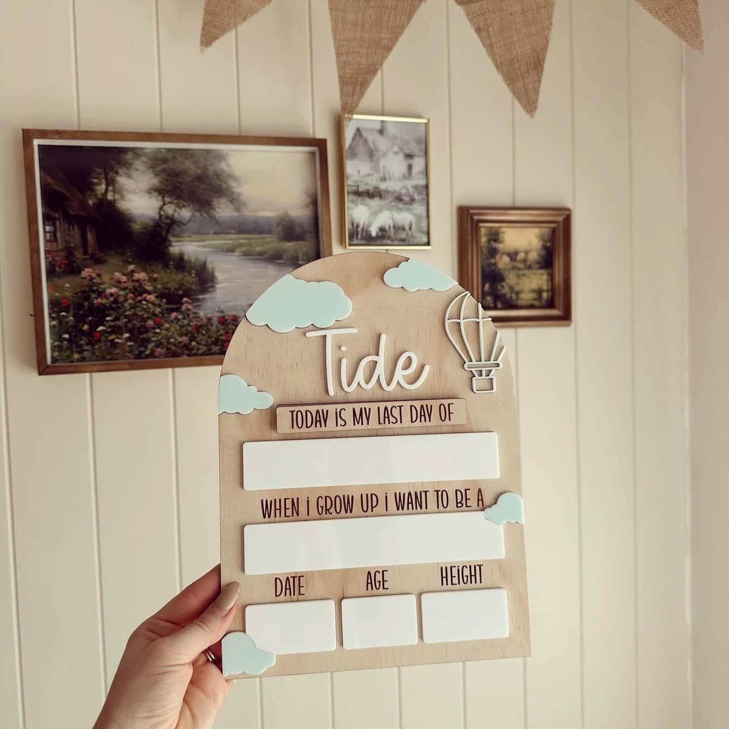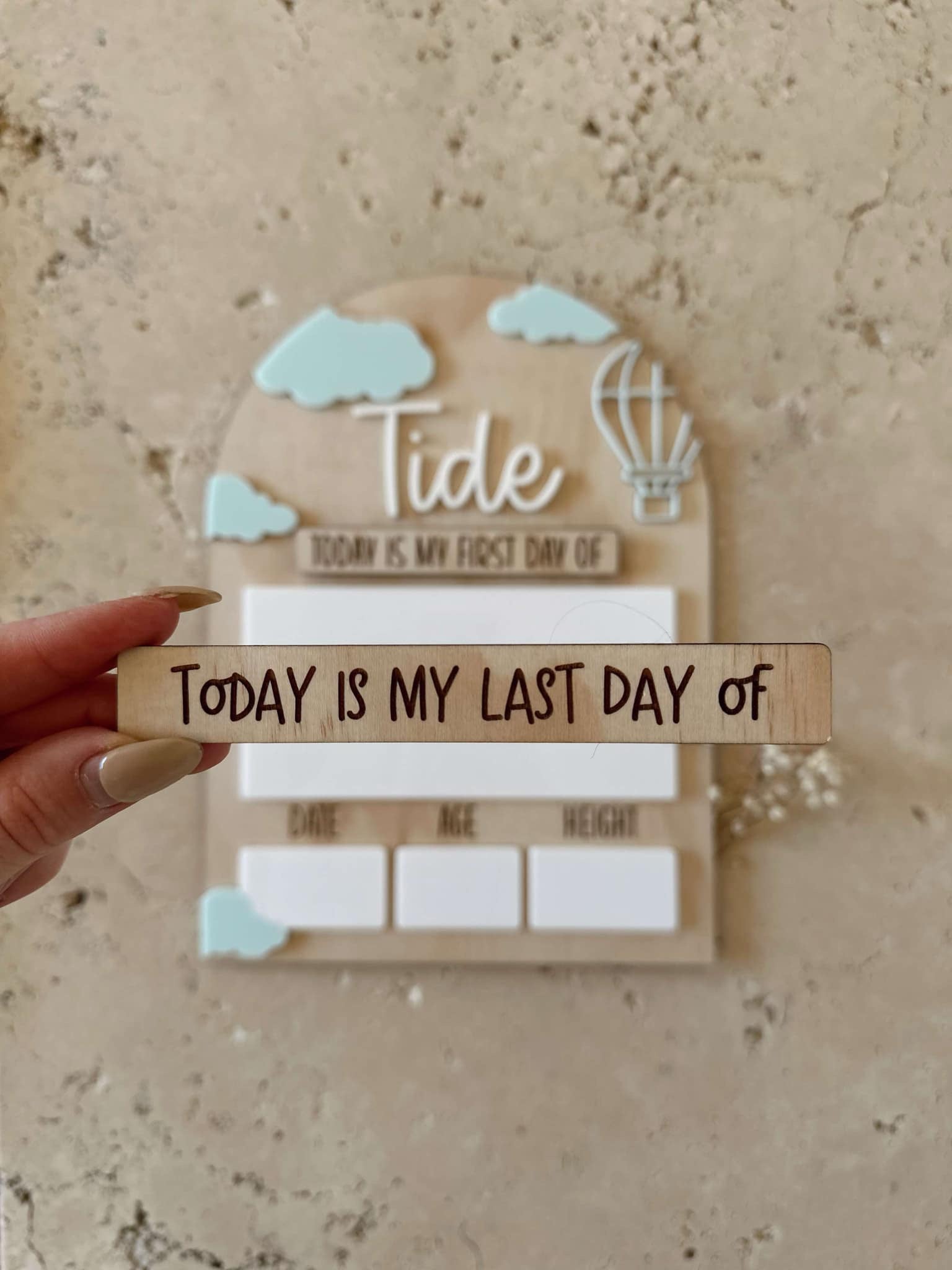 MY FIRST & LAST DAY BOARD with Acrylic Clouds and hot air balloon design along with interchangeable first & last day options. A great way to kick off and end the school year with candid photos of your little one. Keepsake for years to come.
