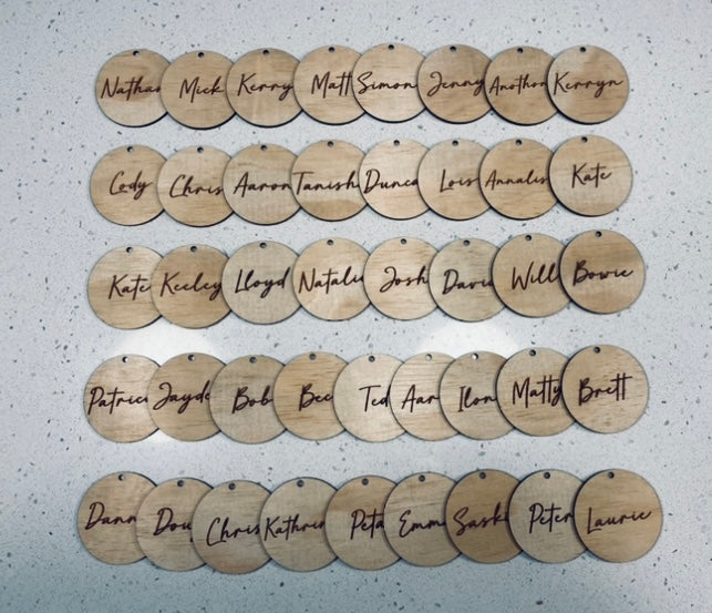 Our laser cut circle wooden place cards / tags are the perfect personalised gift for your wedding guests! The custom name place cards can be used as a special bonbonniere / favour for your guests to remember your amazing wedding day!