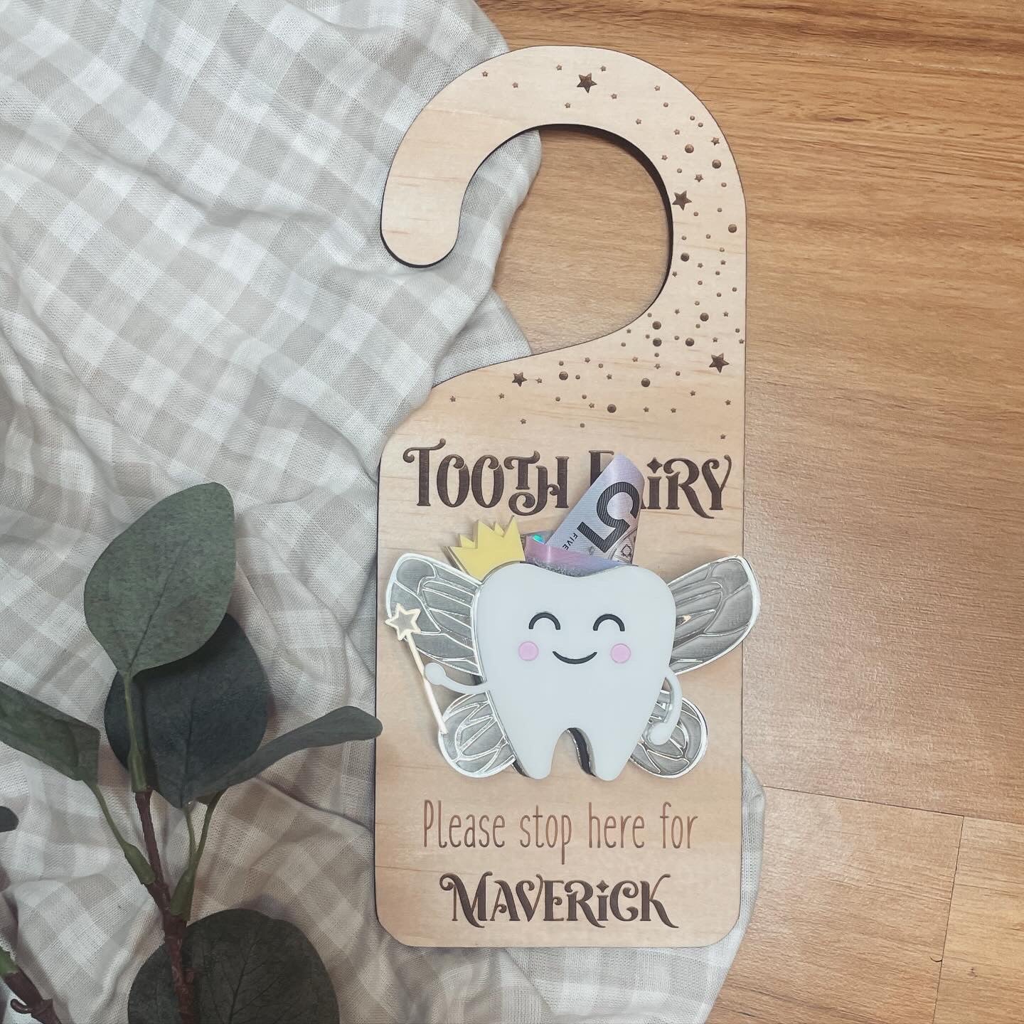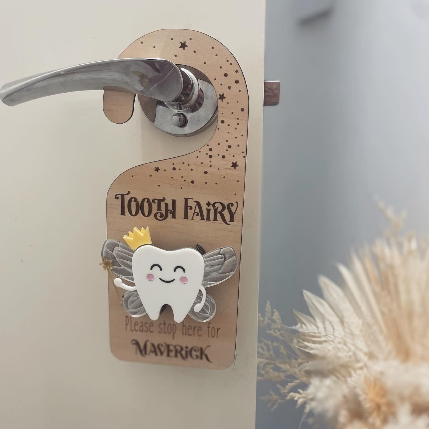 Your hanger will be engraved with, "Tooth Fairy, please stop here for" (as pictured) and will be personalised with your child's name. The raised acrylic tooth has a slot at the top (9mm thick) so a tooth can be placed inside (if you choose) or its a great space to pop some tooth fairy money/notes