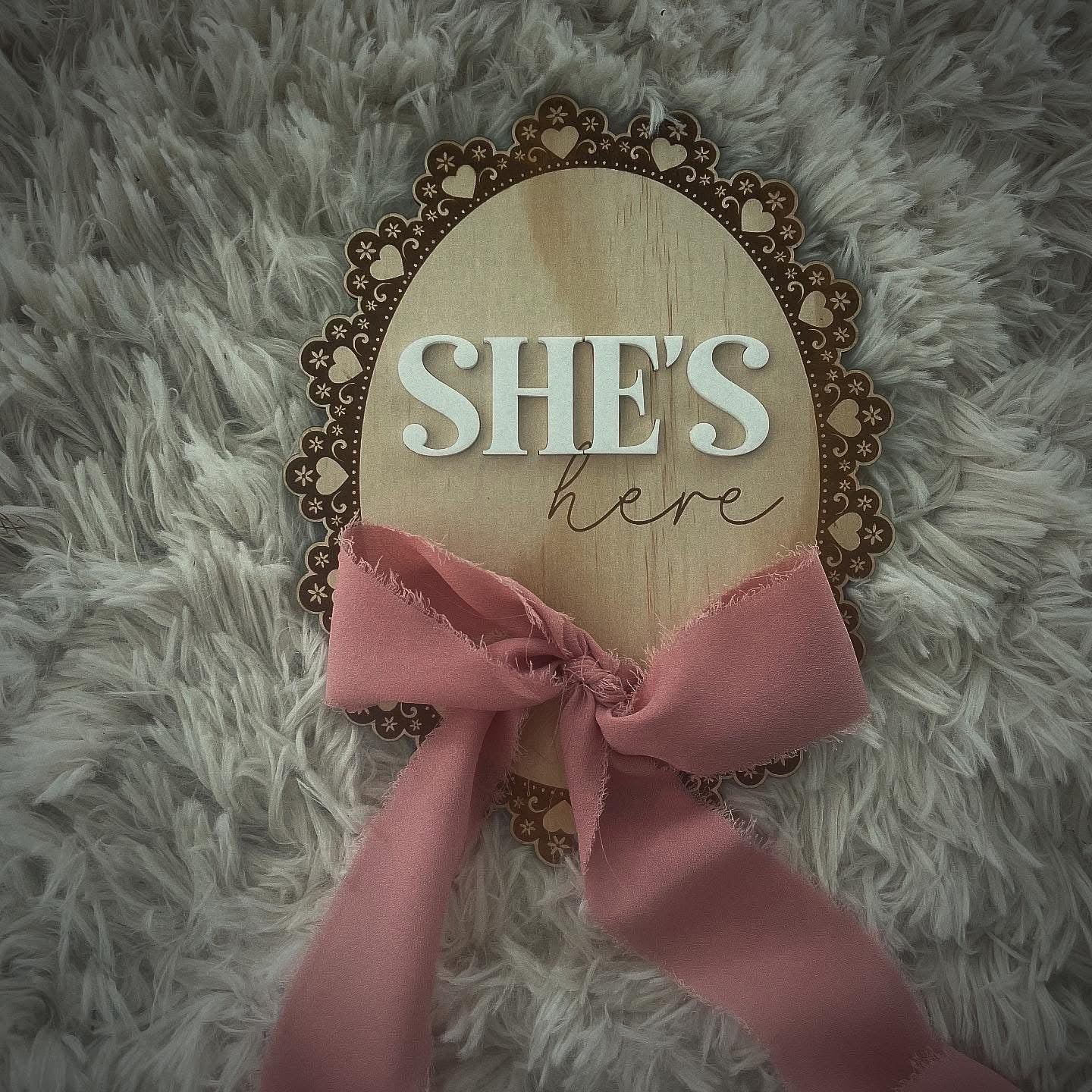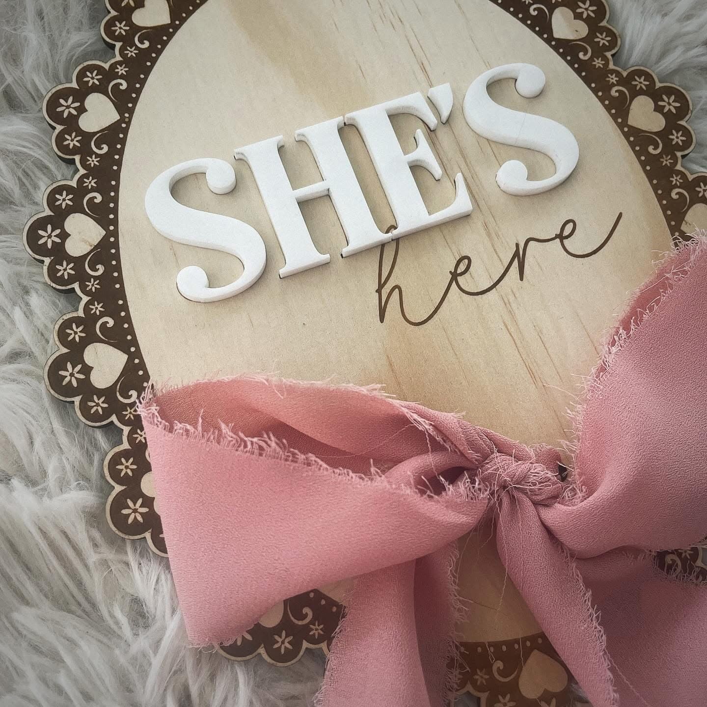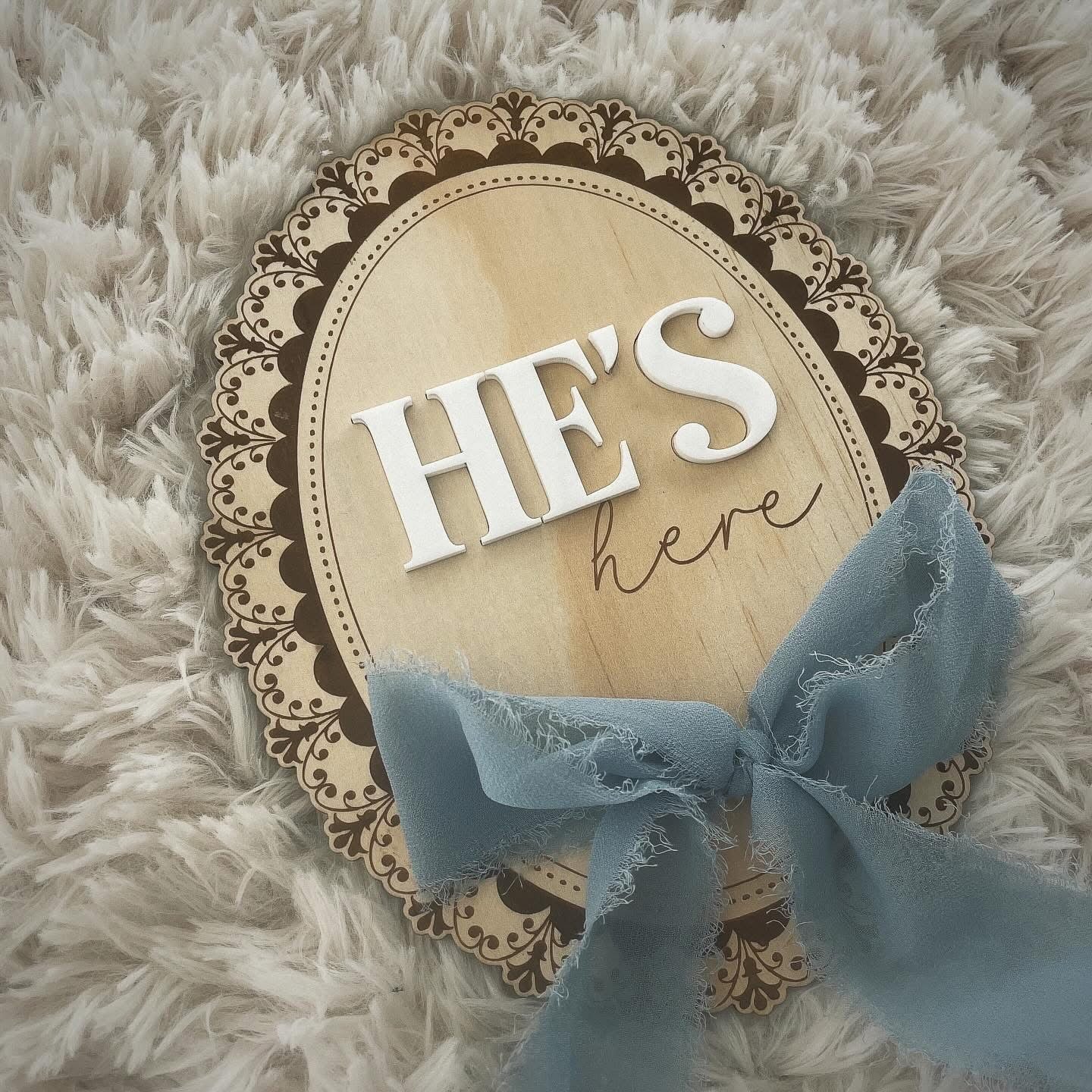 Announce the arrival of your baby with this vintage inspired/lace vibes wooden disc with glossy acrylic 3D lettering and bow to match. 20cm